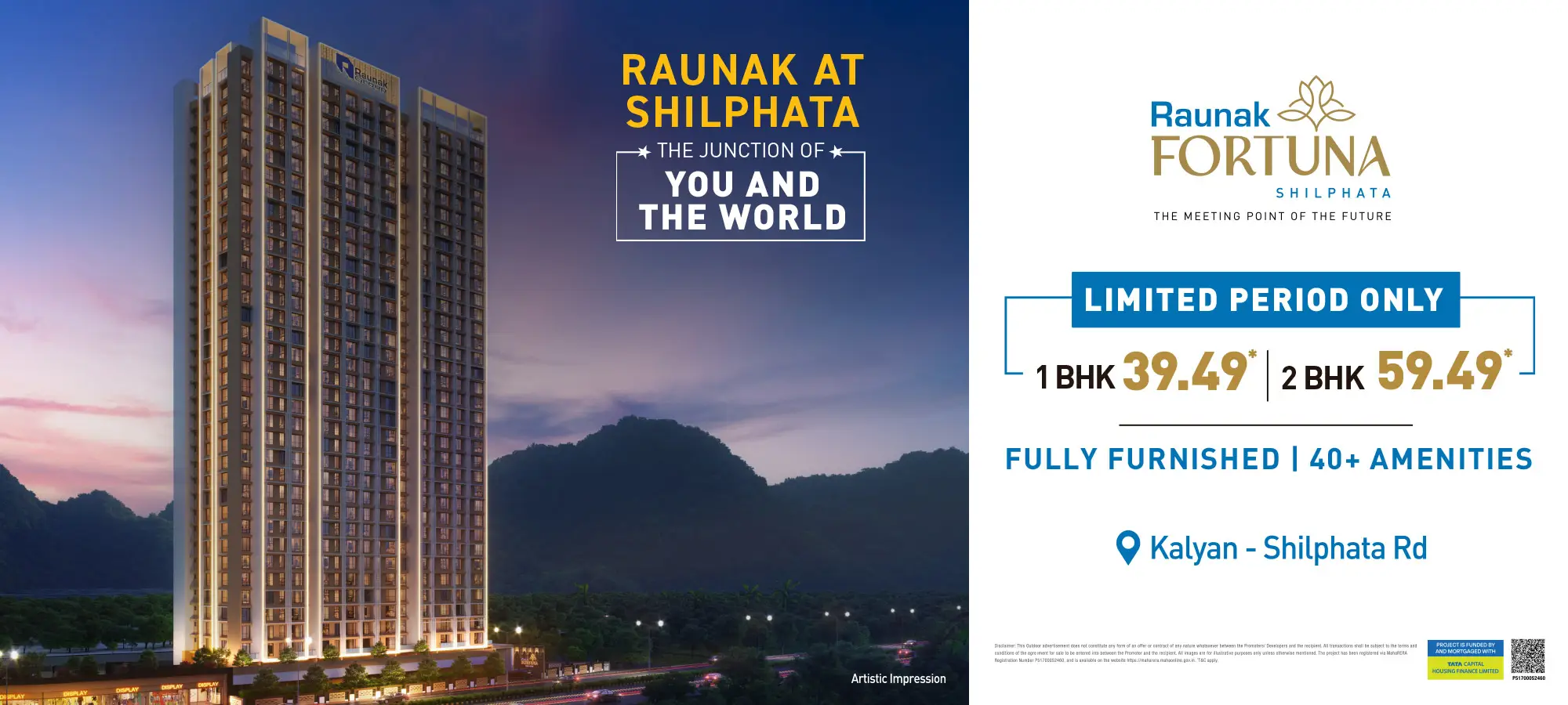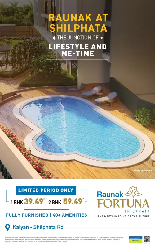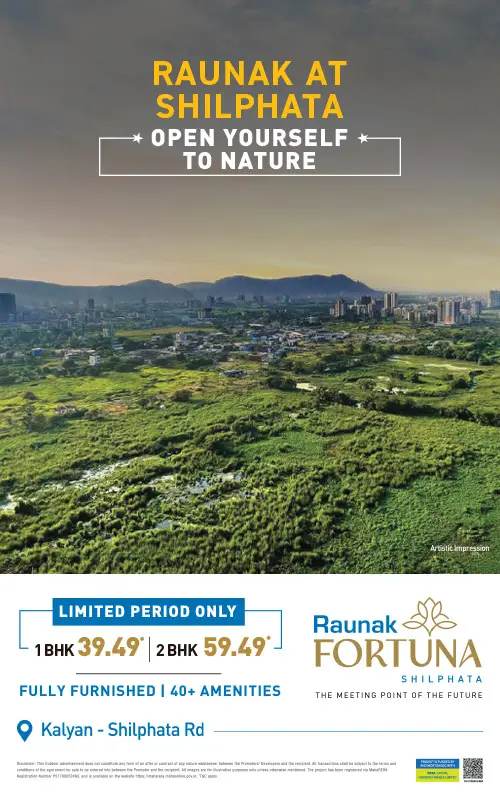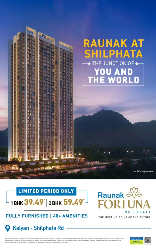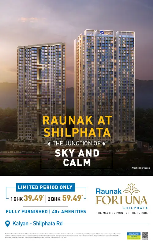 After advancing Thane and Kalyan over 104,00,000 sq ft Team Raunak is here and prepared to embark on the Shilphata story with its fresh new concepts of life and lifestyle. Raunak Fortuna is the Junction of You and the World. It connects the vibrancy of Mumbai and Navi Mumbai with the growth of Thane and Kalyan. We are bringing our entire development experience, lifestyle planning, designs and engineering quality to create the Shilphata story. Raunak Fortuna is a 40-floor project with the hills in the distance and wide open green spaces fields out in front. It is truly a beacon of the brilliant future that awaits Shilphata.